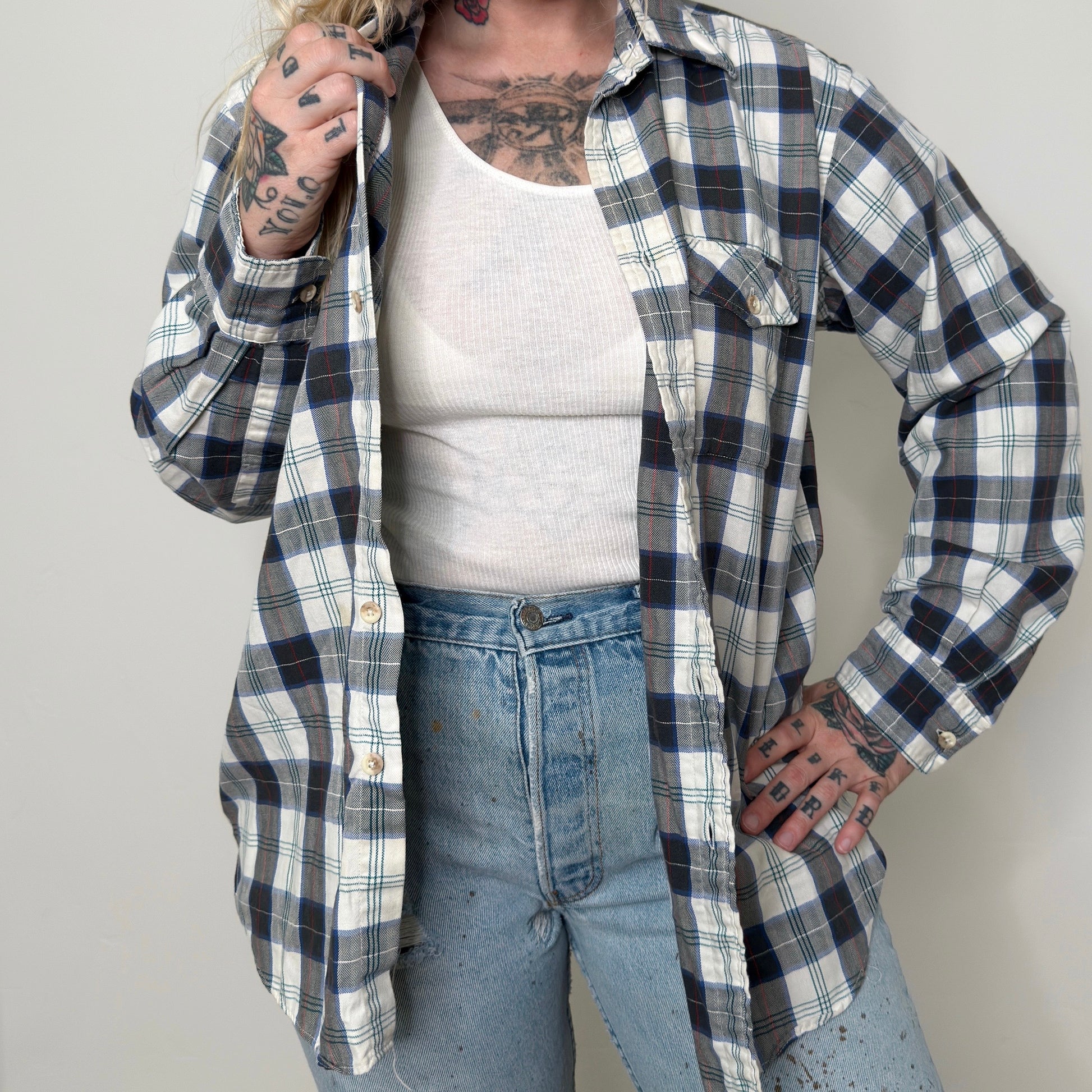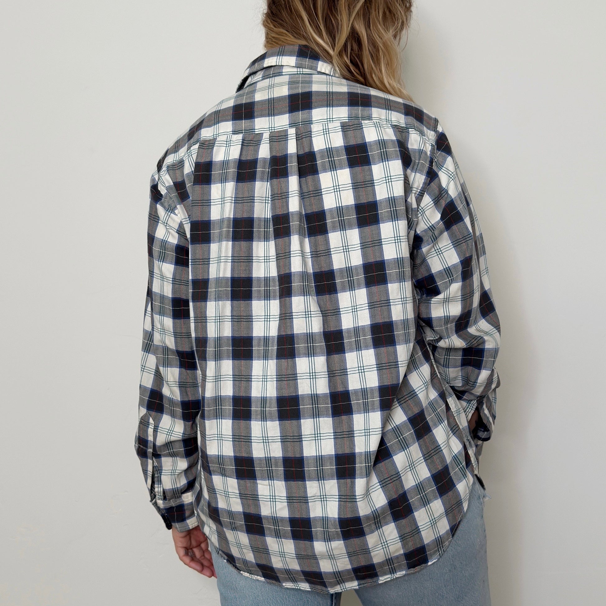 90a LL Bean Black gray white plaid button-up thin button up Mac flannel shirt. Cotton and polyester.
