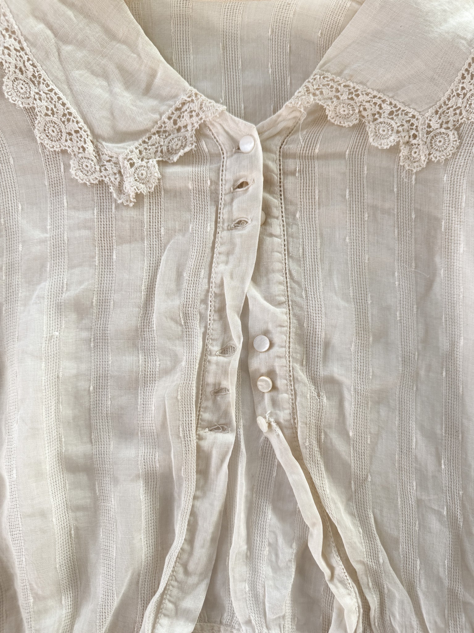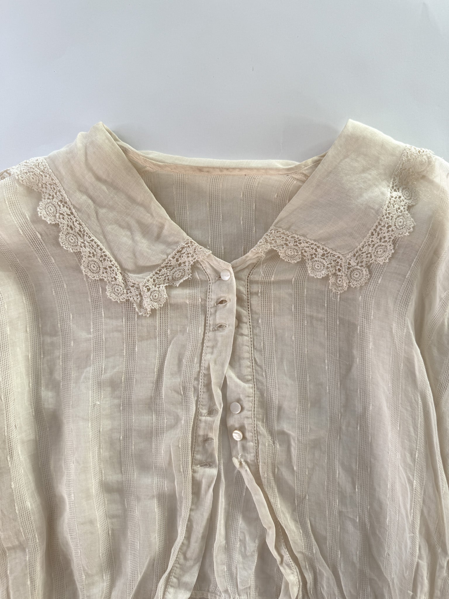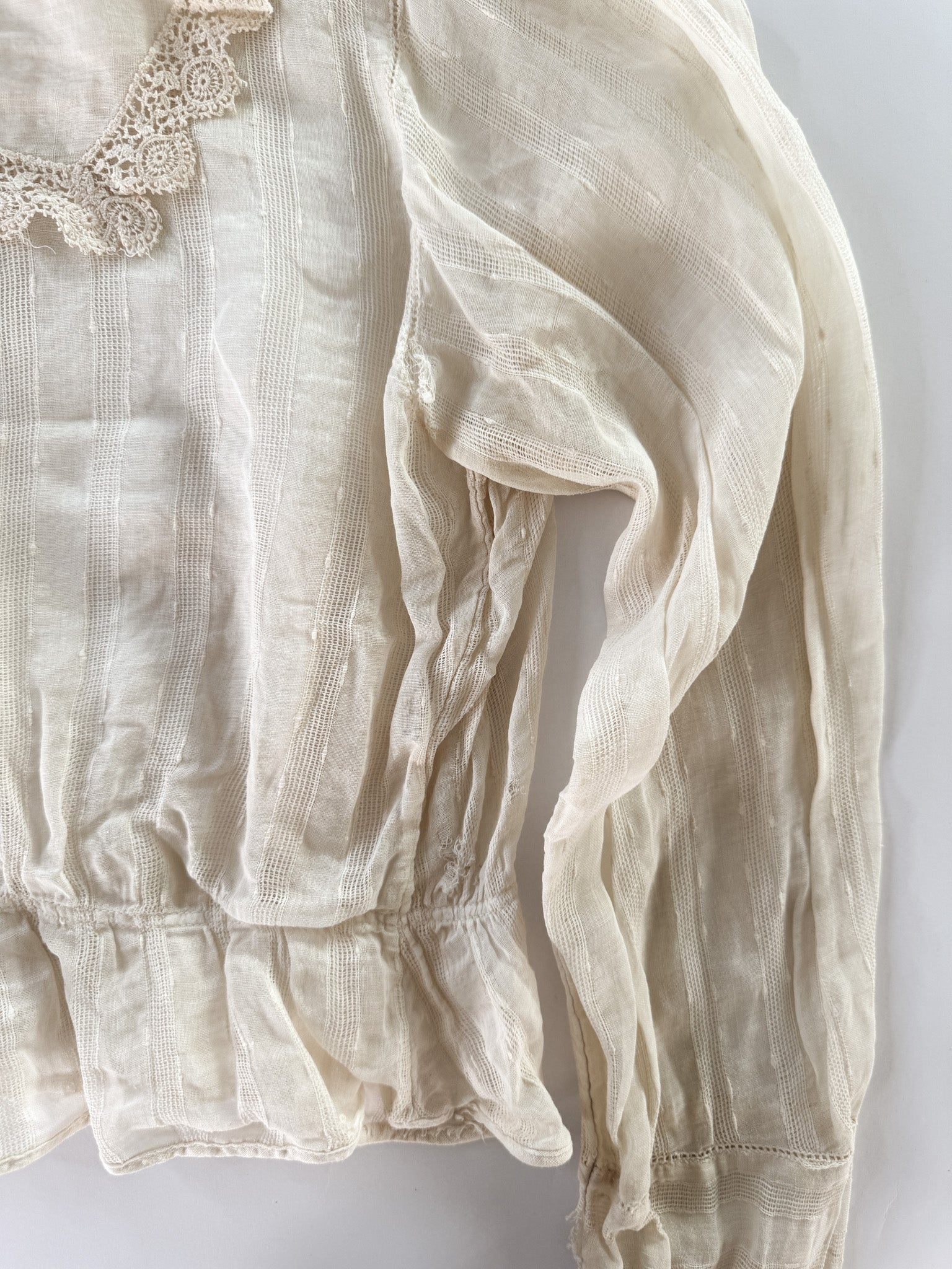 Antique Early 1900s ivory colored blouse with lace trim and buttons. Has some imperfections, some tearing in and weaknesses in the armpits, but very wearable still. Missing one original button. Please see detailed pictures for condition. Looks great by itself or can be work over something.