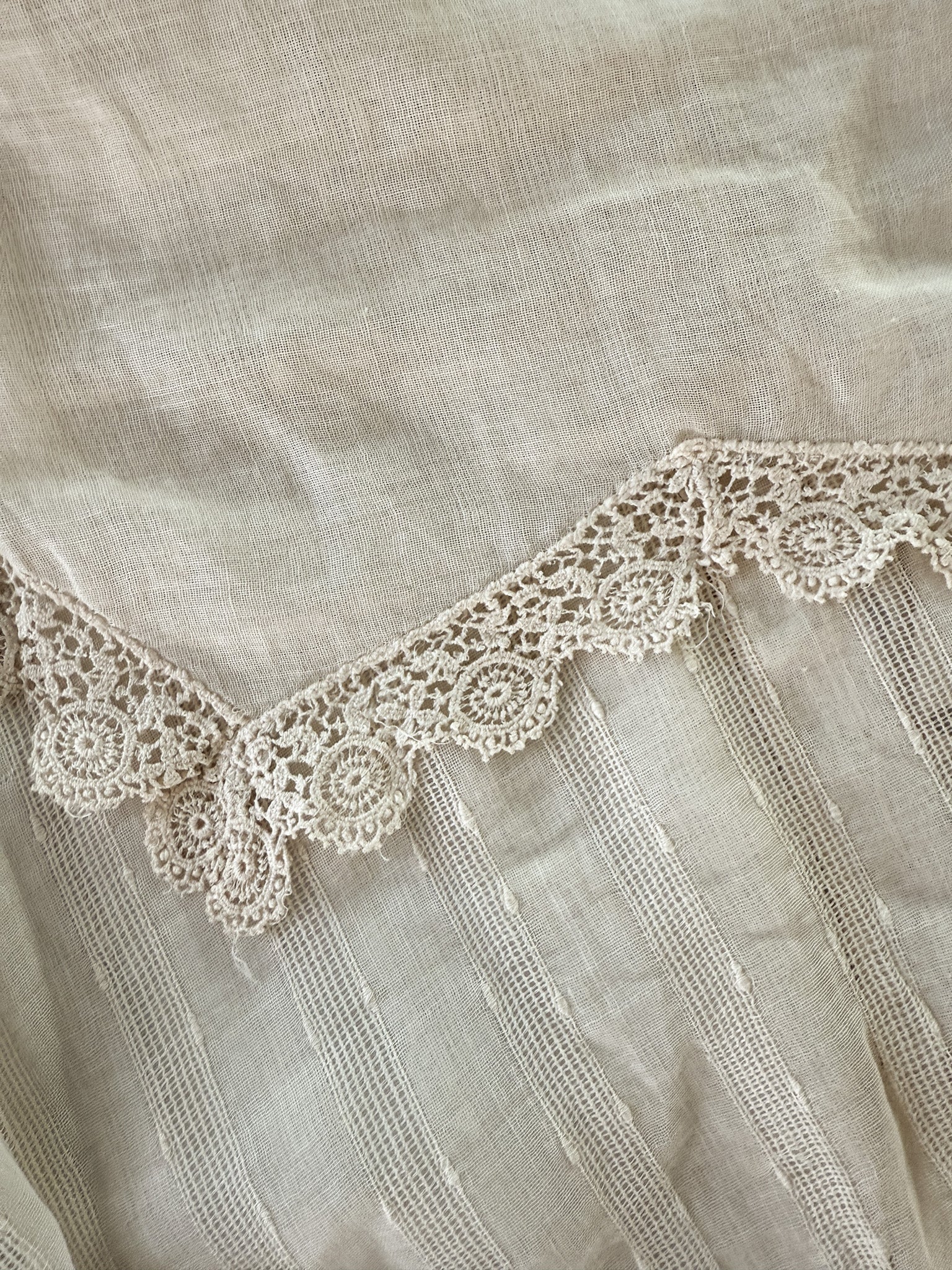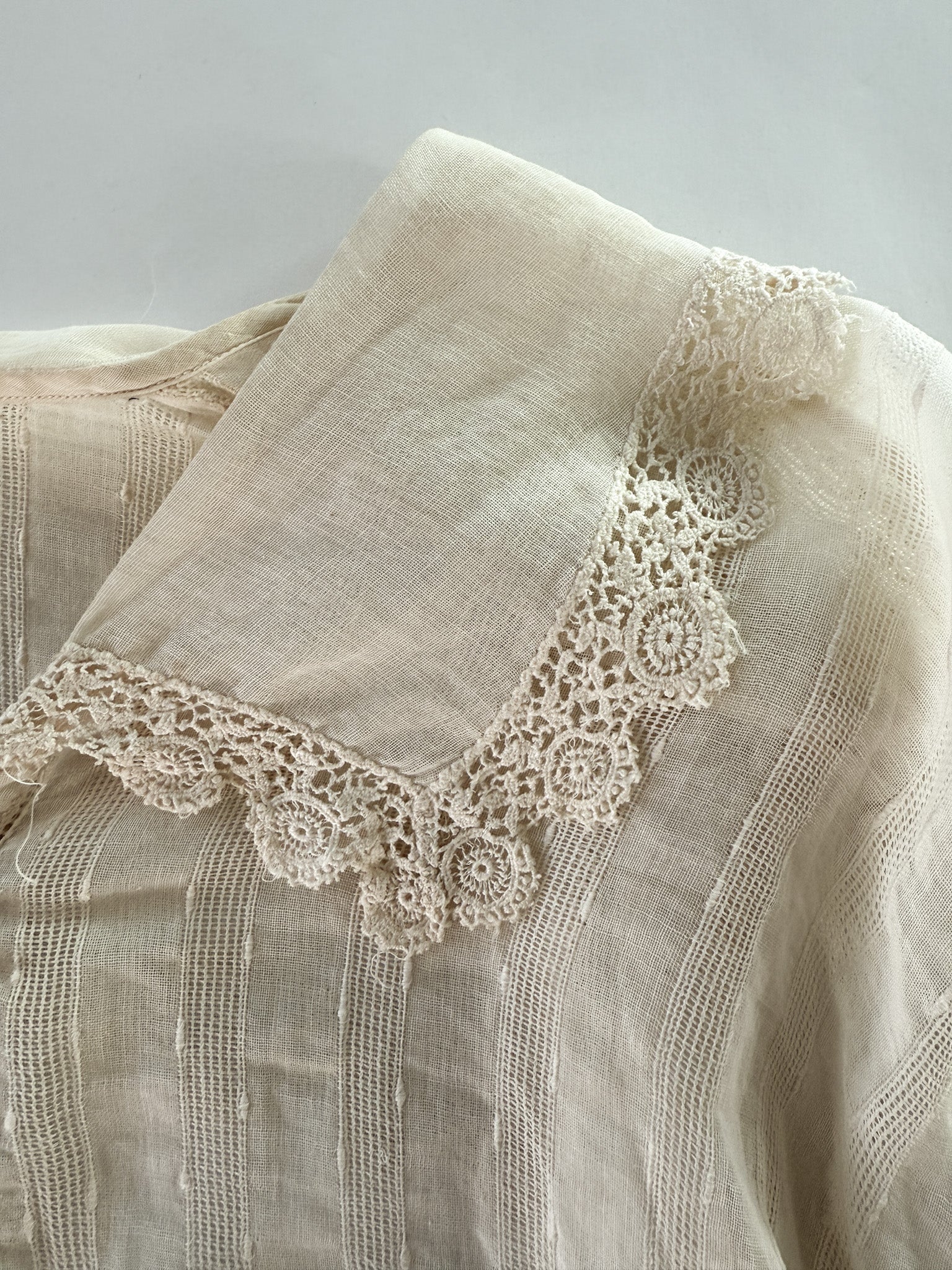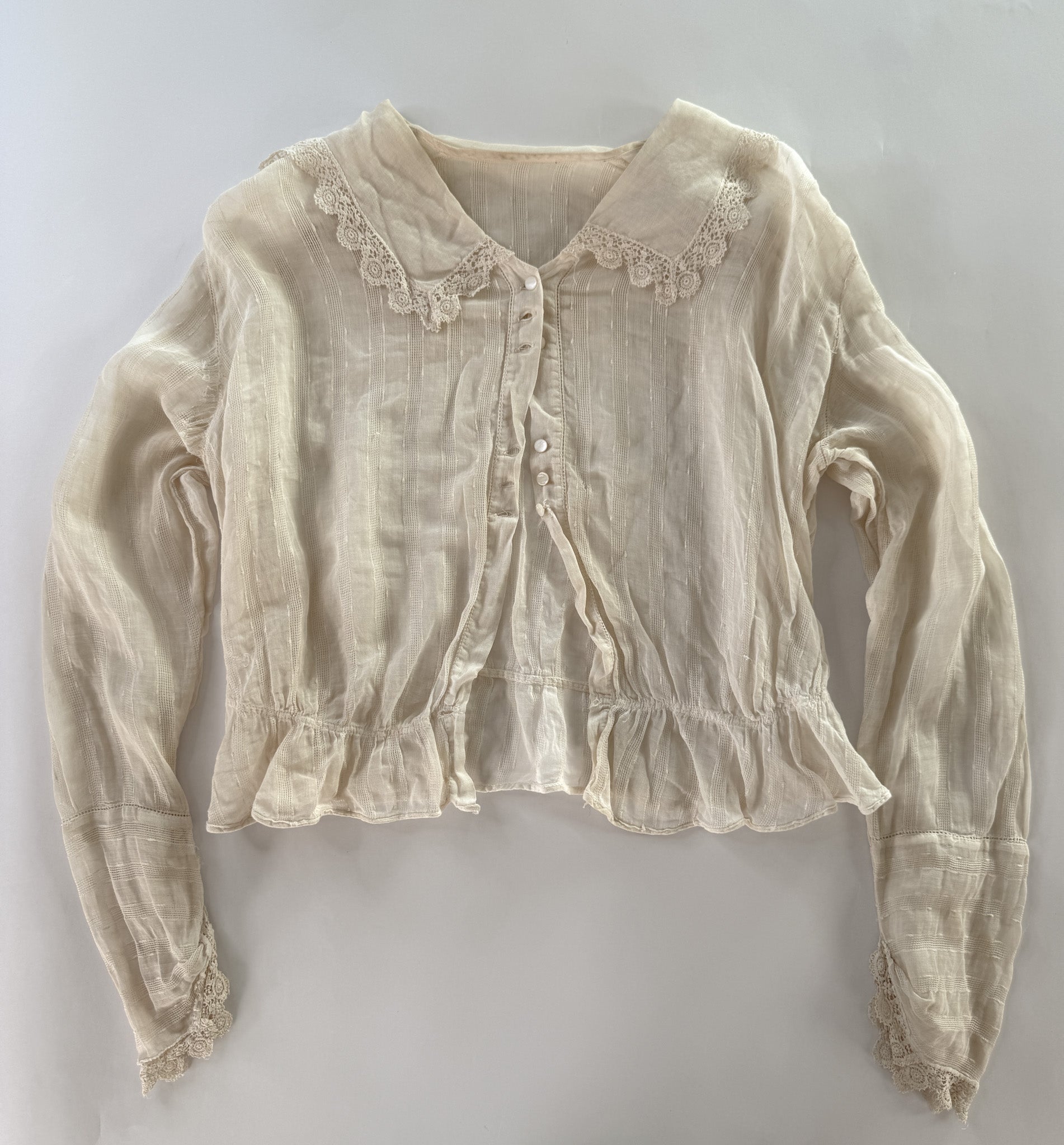 Antique Early 1900s ivory colored blouse with lace trim and buttons. Has some imperfections, some tearing in and weaknesses in the armpits, but very wearable still. Missing one original button. Please see detailed pictures for condition. Looks great by itself or can be work over something.