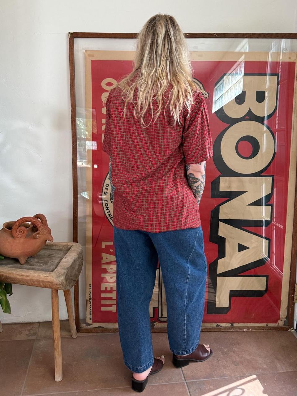 Vintage 1950s Jantzen Red and black plaid short sleeve loop collar button up shirt. Made in the USA, fabric from Europe.