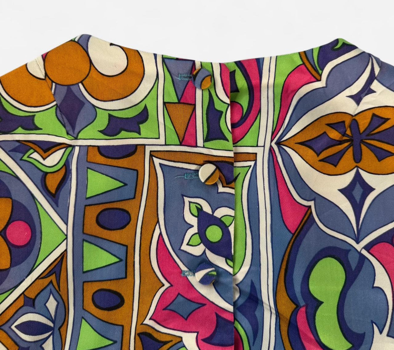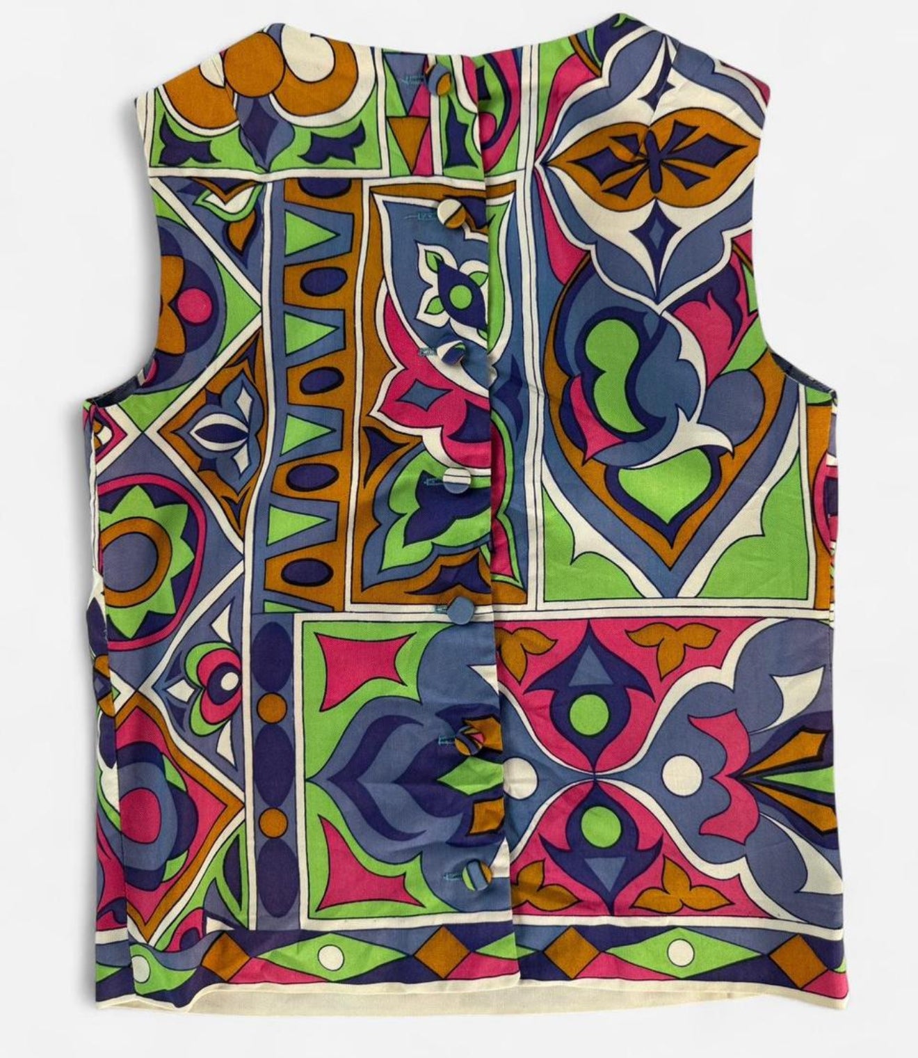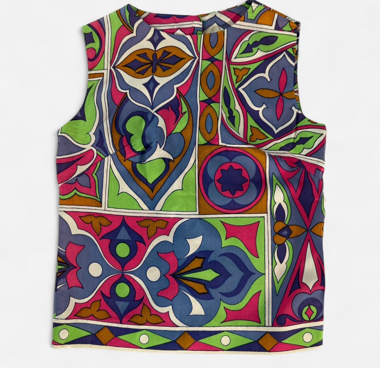 1960s Jo Jr psychedelic print sleeveless shirt with a funky vibe. Very cool rare bright multi color pattern. Button closure in the back. Has no stretch and Custom hem. Acrylic and rayon material.