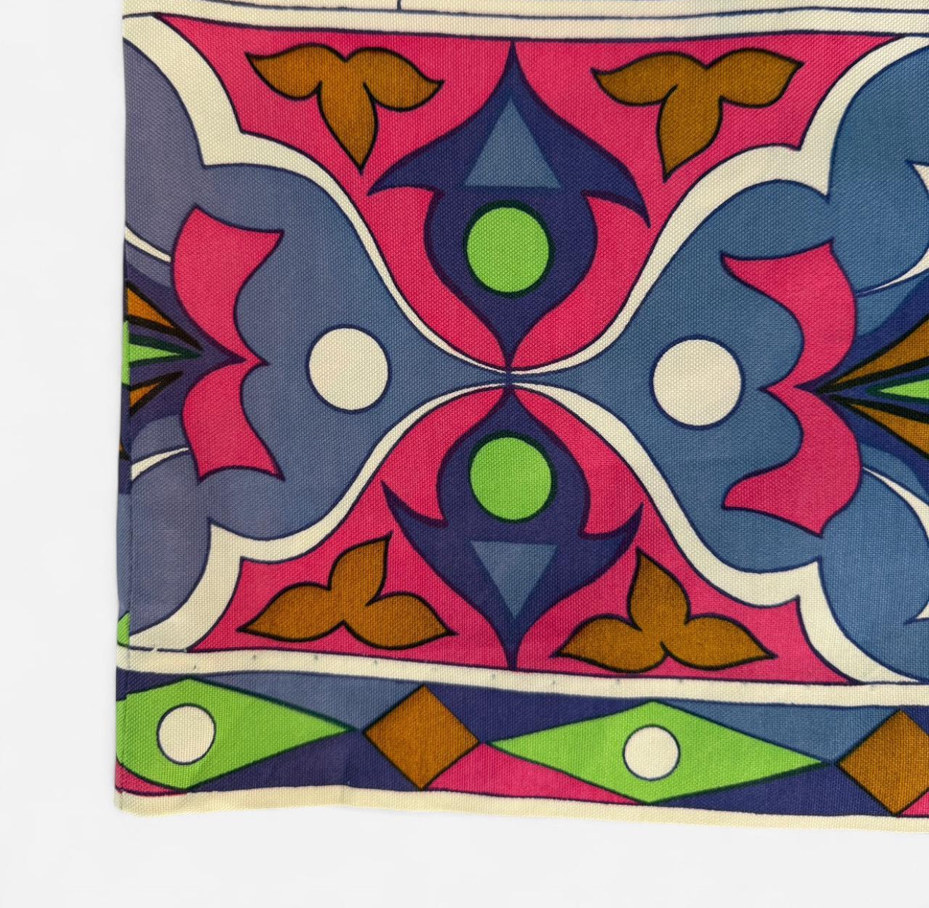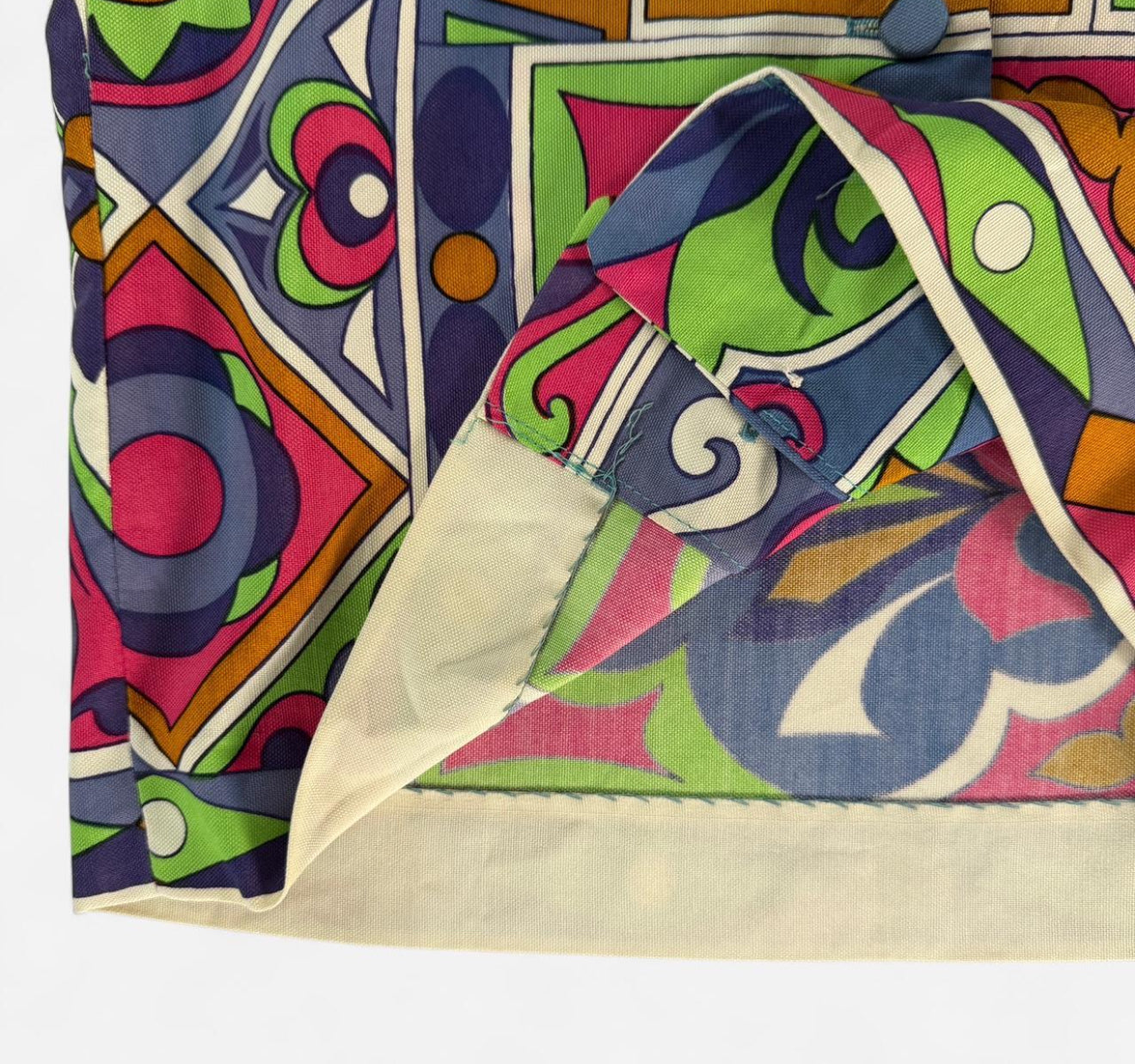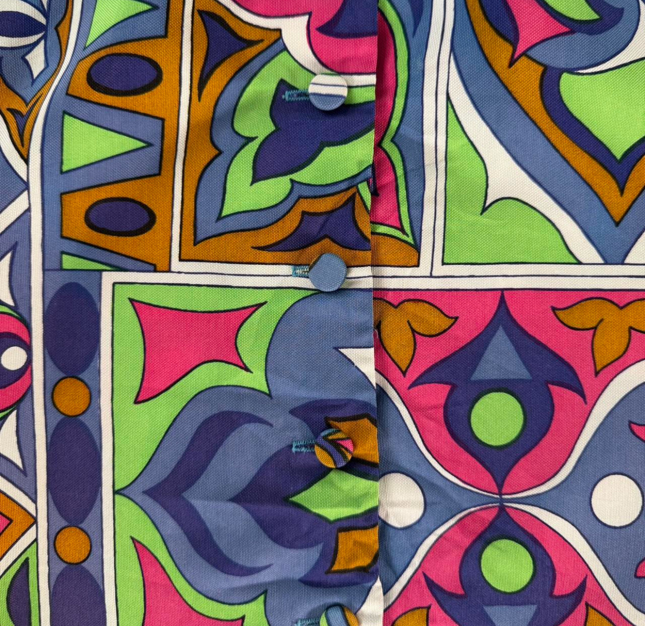 1960s Jo Jr psychedelic print sleeveless shirt with a funky vibe. Very cool rare bright multi color pattern. Button closure in the back. Has no stretch and Custom hem. Acrylic and rayon material.
