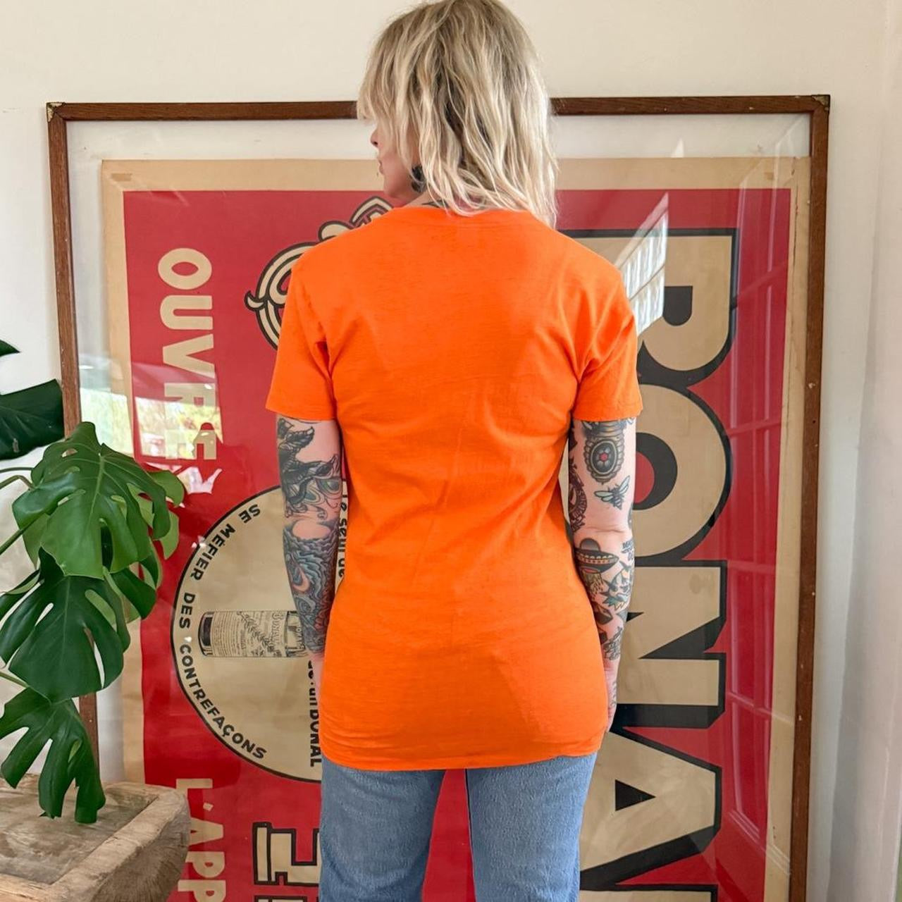 Vintage 1970s 1980s Dinos Pizza “eat it all brother” orange t shirt. Small stains on the back. Shirt is long. 100% cotton.