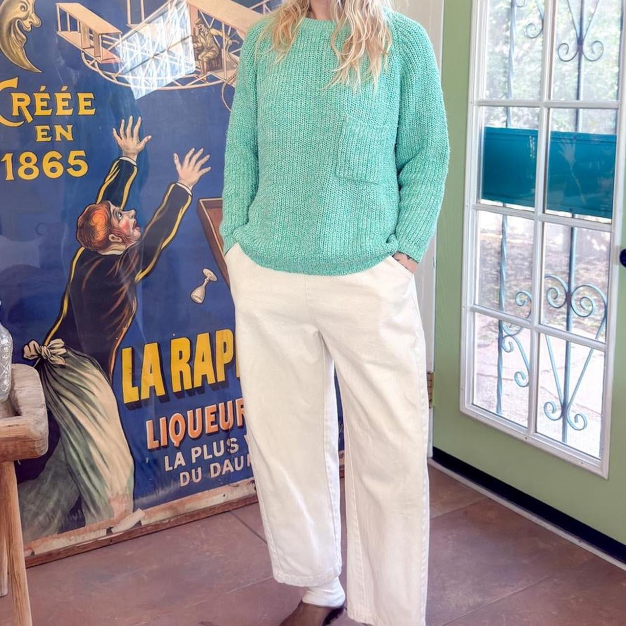mint green, knit sweater, seafoam, turquoise, cotton, vintage, 80s, cozy, oversized, front pocket