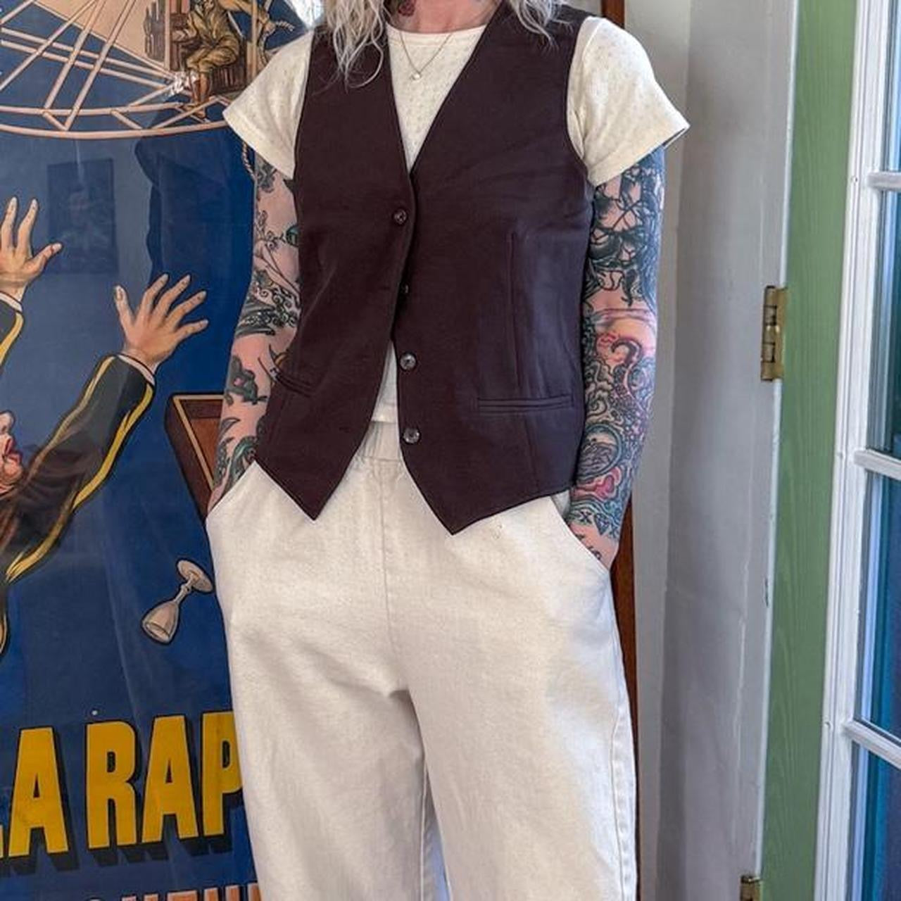 dark brown, button-up vest, layered style, polyester blend, retro, 80s 90s, casual chic, fitted, versatile, vintage-inspired