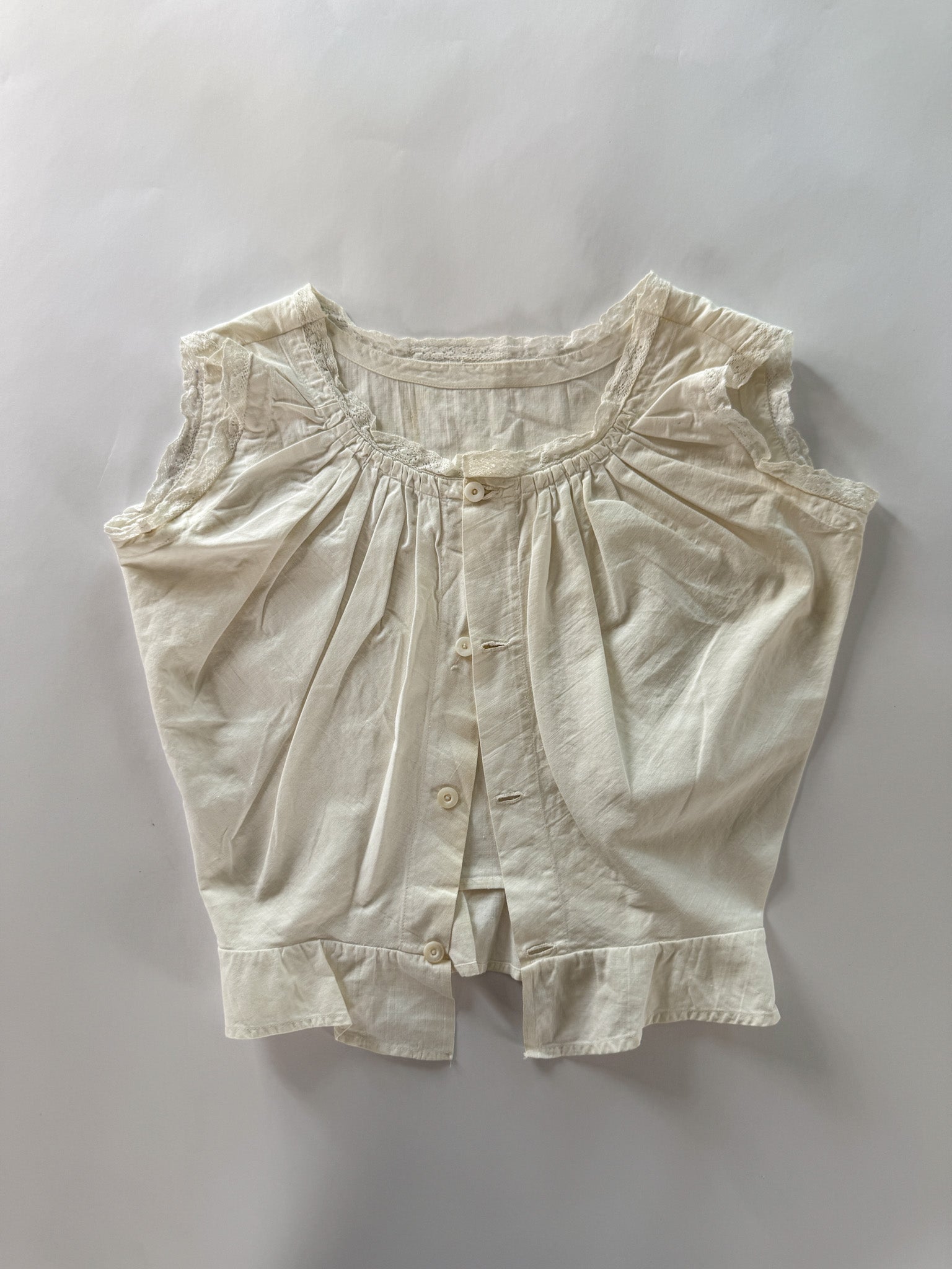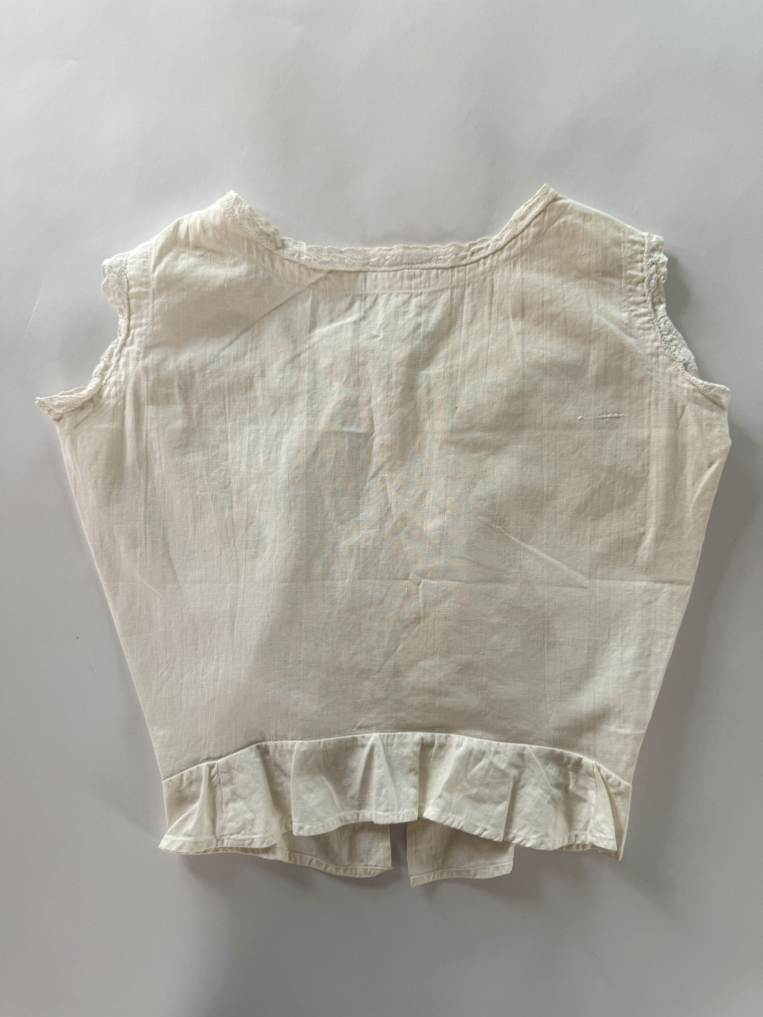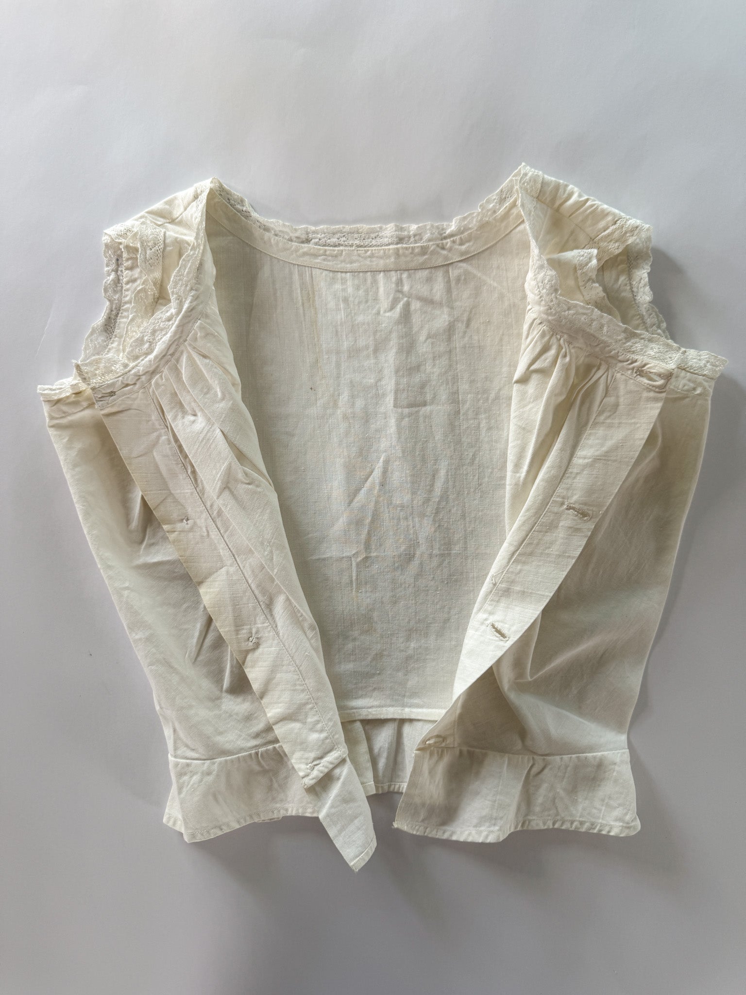 Vintage Antique Edwardian early 1900s button up Corset Cover. Beautiful lace detail around arms and neck. Biggest flaws include some discoloration and small staining. Has a repair on the back.