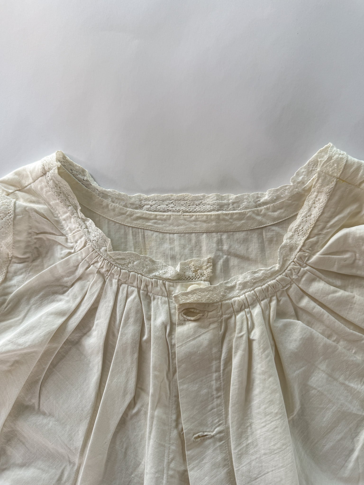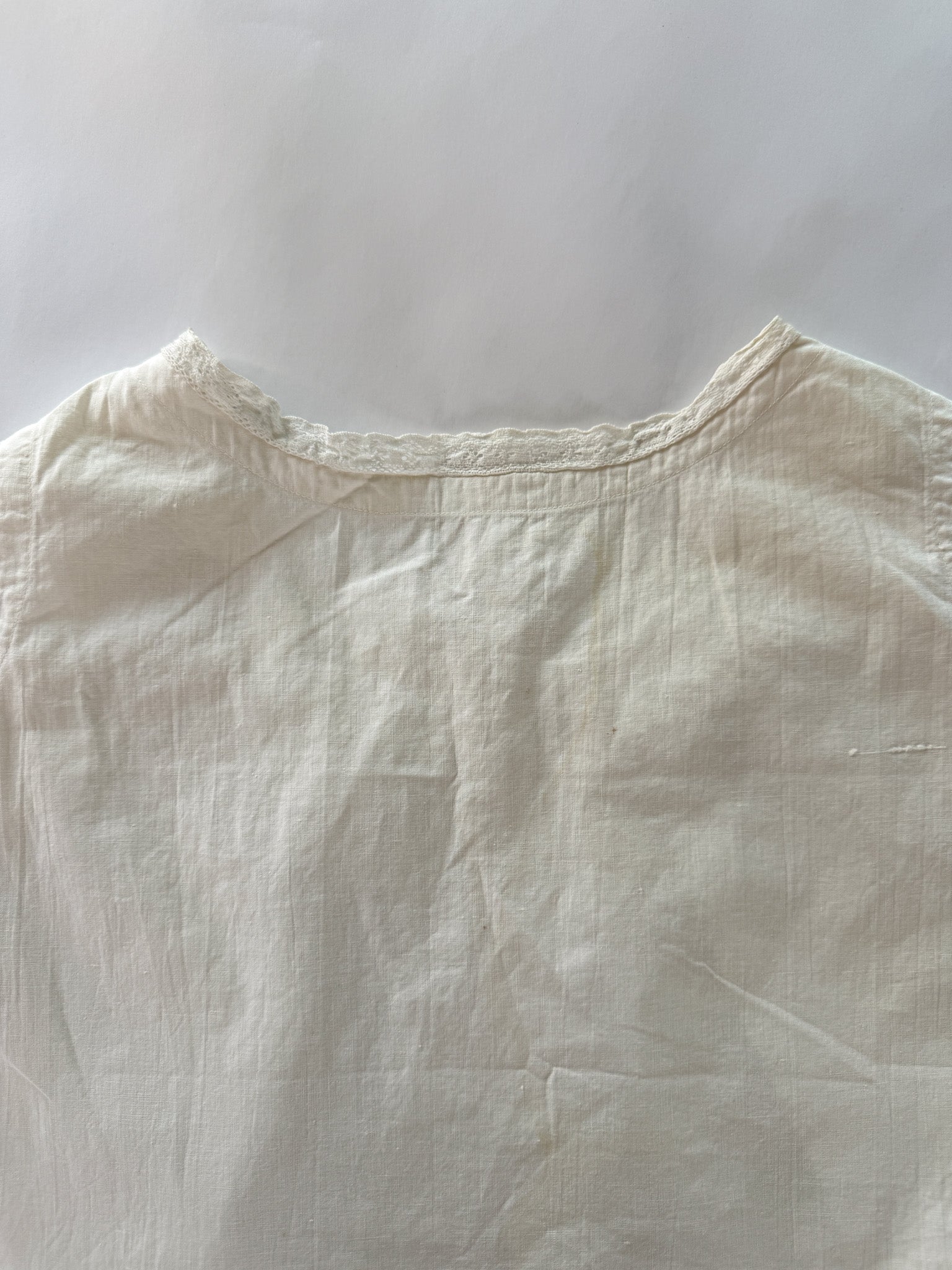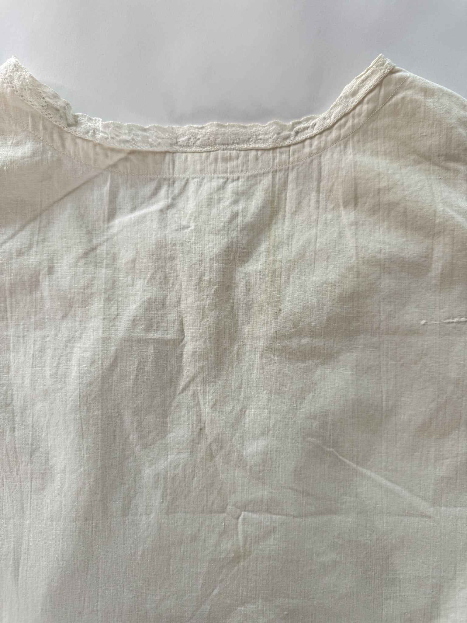 Vintage Antique Edwardian early 1900s button up Corset Cover. Beautiful lace detail around arms and neck. Biggest flaws include some discoloration and small staining. Has a repair on the back.