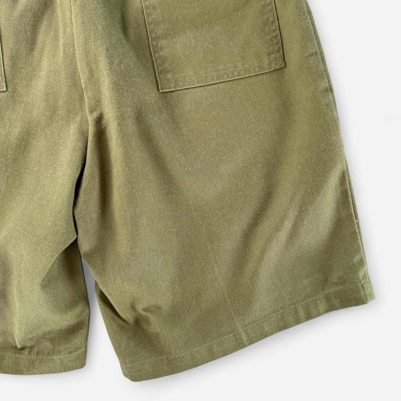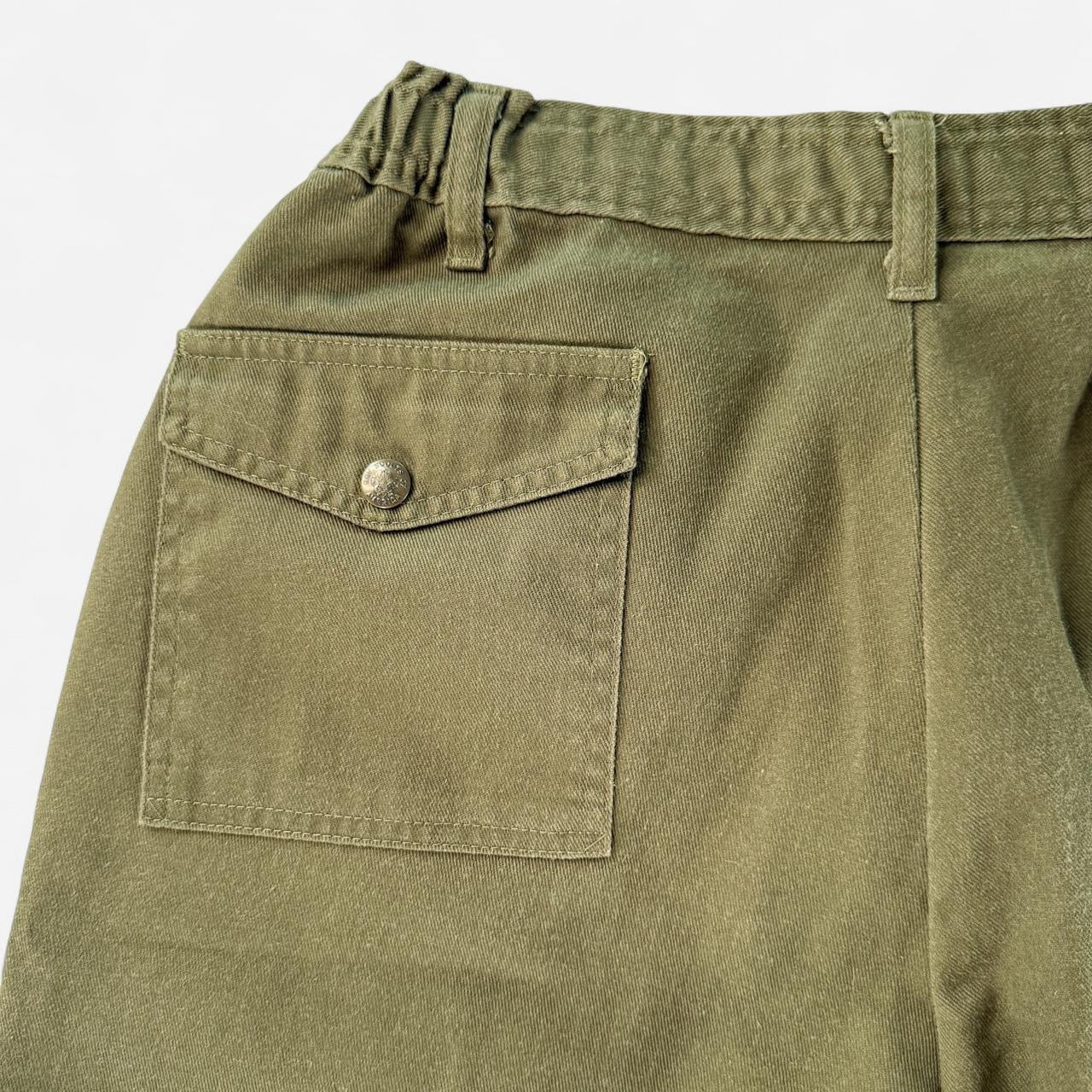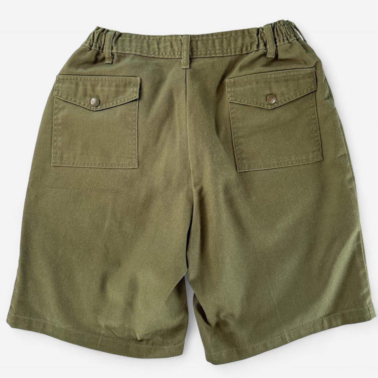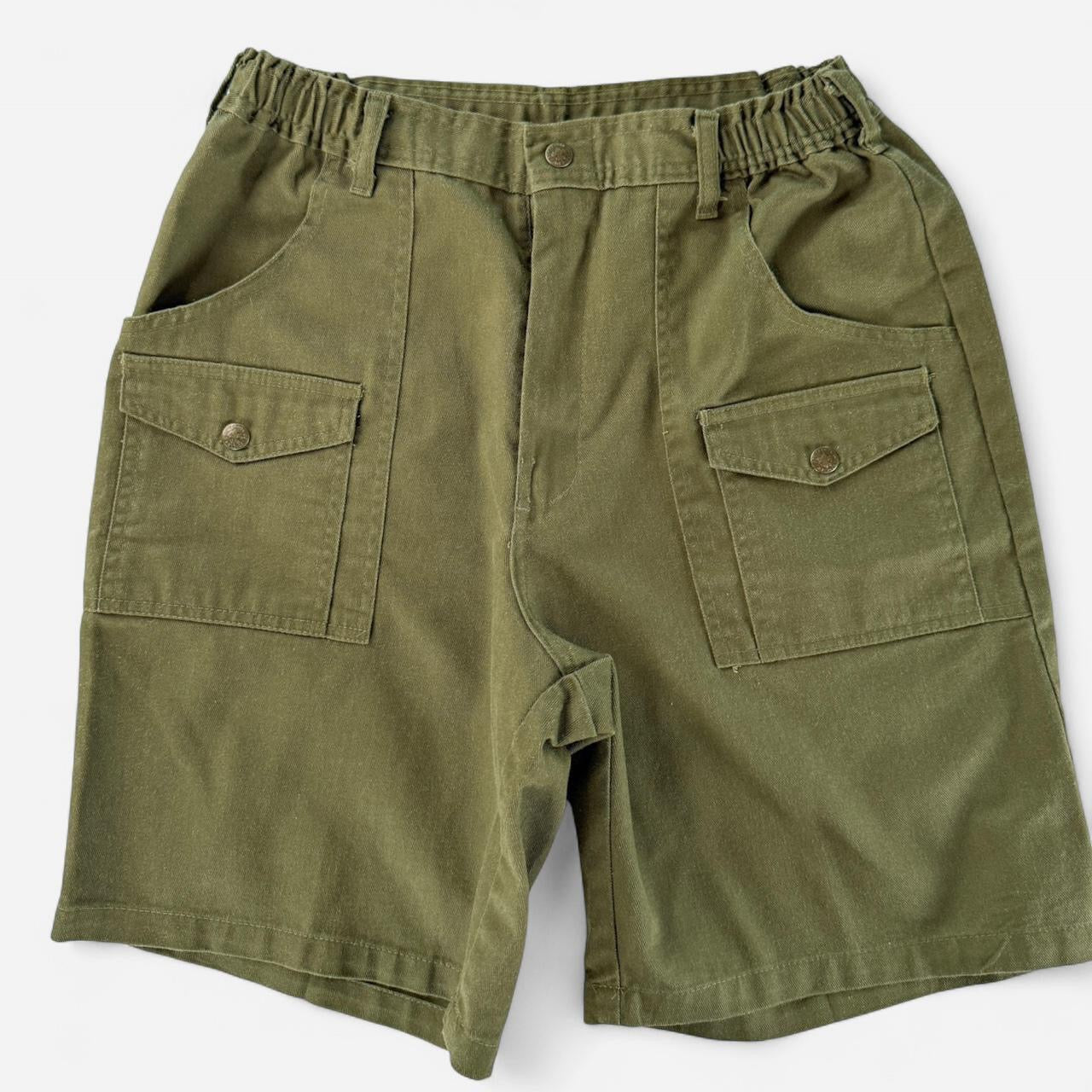 Vintage high waisted boys scout green utility shorts with adjustable waistband and zipper fly. Flat front pockets and two small pockets.